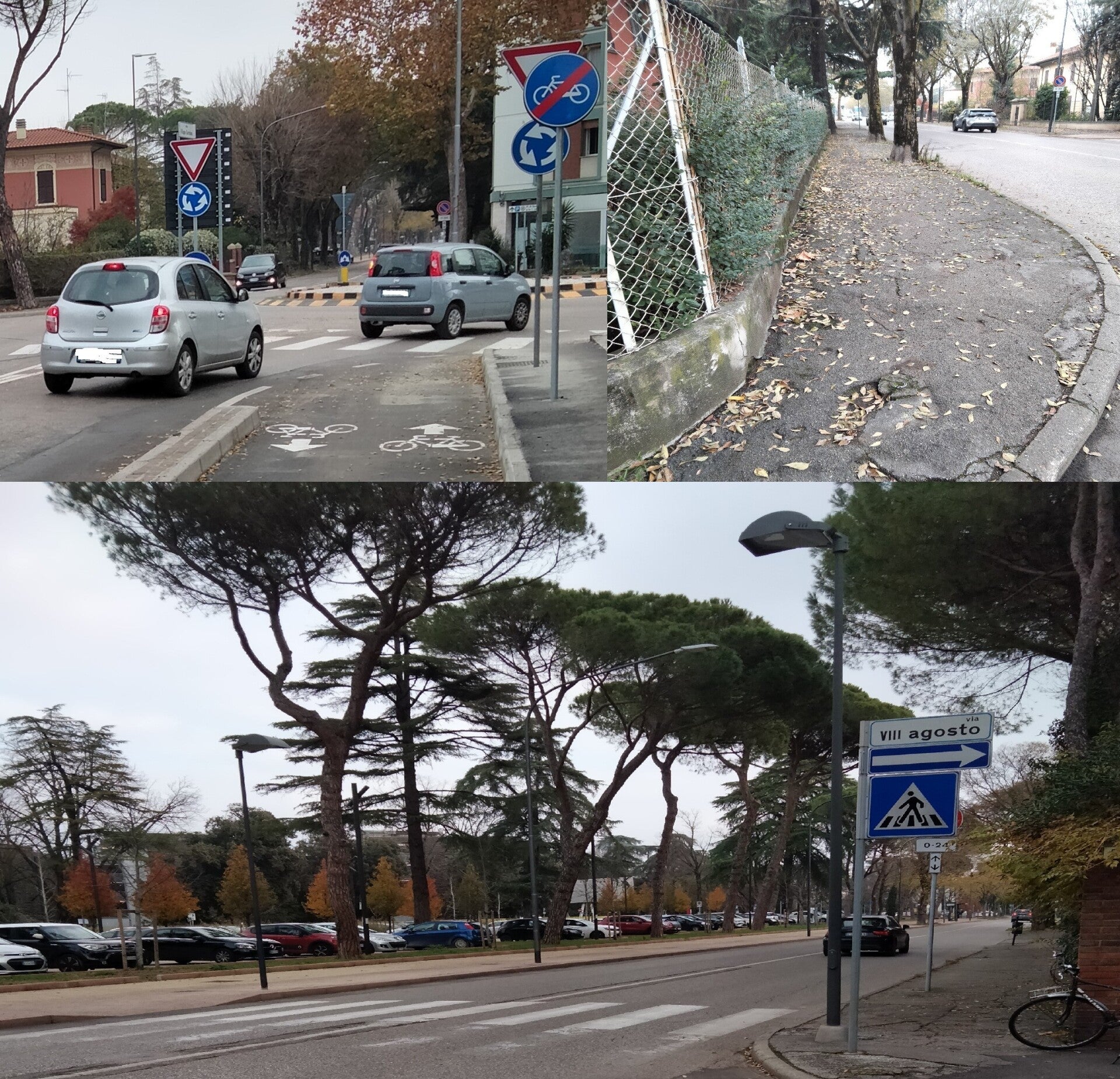 La gemella è quella che si trova nella parte opposta del viale Corridoni praticamente parallela a quella all’interno della Rocca. Una pista ciclabile in buono stato e percorribile agevolmente (per questo l’altra non serviva) ma che a un certo punto si ferma. Finisce alla rotatoria di Viale II Giugno. Se sei in bici e devi procedere fino al Campus Universitario devi percorrere, pericolosamente, un tratto di viale Corridoni oppure farlo sul marciapiede (sapendo che non si può fare) fino all’incrocio con la via VIII Agosto dove c’è un passaggio pedonale che permette di attraversare viale Corridoni e andare sulla ciclabile del Campus.